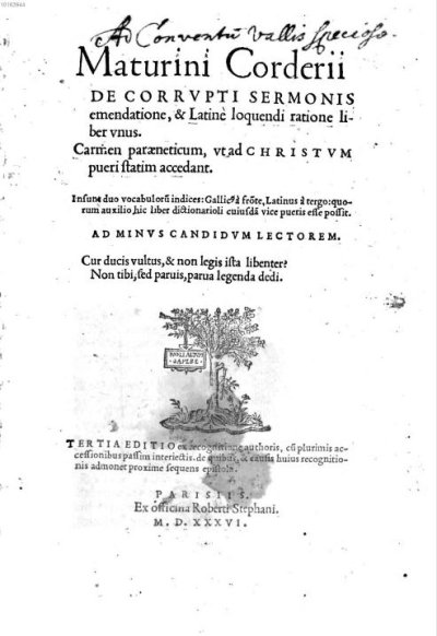 Cordier Mathurin● De corrupti sermonis emendatione libellus● Lyon : Sébastien Gryphe● 1536● USTC : 78075 . Beaulieux, 1904 : p.378-379 , «Cordier (Mathurin). ». Lindemann, 1994 : p.612, «Mathurin CORDIER».