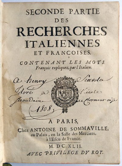 Oudin Antoine]● Seconde partie des recherches italiennes et françoises● Paris : Antoine de Sommaville● 1642● 2 langues : Français ♢ Italien ♢