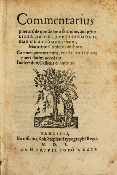 Cordier Mathurin● Commentarius puerorum de quotidiano sermone ♢ De corrupti sermonis emendationeBnF/USTC● Paris : Robert I Estienne● 1550 et (1551)● Commentarius || puerorũ de quotidiano sermone, qui prius || LIBER DE CORRVPTI SERMONIS || EMENDATIONE dicebatur, || Maturino Corderio authore. || Carmen paræneticum, vt ad CHRISTVM || pueri statim accedant. || Indices duo, Gallicus & Latinus. || [Vignette : NOLI ¦ ALTUM SAPERE] || PARISIIS, Ex officina Rob.Stephani typographi Regii. || M. D. L. || CVM PRIVILEGIO REGIS. ● USTC : 58019 , 196256 . Beaulieux, 1904 : p.378-379 , «Cordier (Mathurin). ». Lindemann, 1994 : p.613, «Mathurin CORDIER».