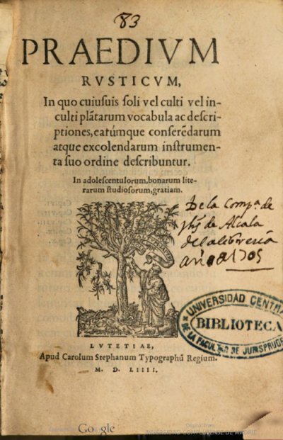 Estienne Charles]● Praedium rusticum● Paris : Charles Estienne● 1554● PRAEDIVM || RVSTICVM, || In quo cuiusuis soli vel culti vel in- || culti plãtarum vocabula ac descri- || ptiones, earúmque conserẽdarum || atque excolendarum instrumen- || ta suo ordine describuntur. || In adolescentulorum, bonarum lite- || rarum studiosorum, gratiam. || [Device] || LVTETIAE, || Apud Carolum Stephanum Typographũ Regium. || M. D. LIIII. USTC ● USTC : 88528 . Musée Virtuel des Dictionnaires (MVD).