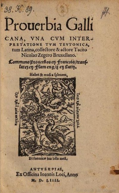 Zegerus Tacitus Nicolaus● Proverbia Gallicana, una cum interpretatione tum Teutonica, tum Latina [...] Communs proverbes en Francois, translatez en Flameng, et en Latin● Anvers : Ex officina Ionnas Loëi● 1554● USTC : 410964 . 3 langues : Français ♢ Latin ♢ Néerlandais ♢