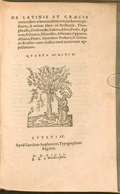 Estienne Charles]● De latinis et graecis nominibus arborum, fruticum, herbarum, piscium et avium liber● Paris : Charles Estienne● 1554● DE LATINIS ET GRAECIS || nominibus arborum, fructicum, herbarum, pi- || scium, & auium liber : ex Aristotele, Theo- || phrasto, Dioscoride, Galeno, Aëtio, Paulo, AEgi || neta, Actuario, Nicandro, Athenaeo, Oppiano, || AEliano, Plinio, Hermolao Barbaro, & Iohan- || ne Ruellio : cum Gallica eorũ nominum ap- || pellatione. || QVARTA AEDITIO. || [device : tree and man] || LVTETIAE. || Apud Carolum Stephanum, Typographum || Regium. || M. D. LIIII. ● USTC : 67916 . Beaulieux, 1904 : p.382 , «Estienne (Charles). ». Lindemann, 1994 : p.565, «[Charles ESTIENNE]».