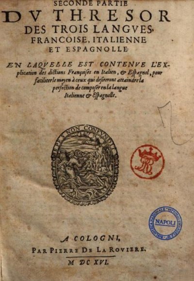 Vittori Girolamo● Tesoro de las lenguas, francesa, italiana y española. [et] Thresor des trois langues, francoise, italienne, et espagnole [et] Tesoro delle tre lingue, italiana, francese e spagnuola● Cologny ou [Genève] : Samuel Crespin, Pierre de La Rovière● 1616-1617● 3 tomes● USTC : 5023985 . 13 localisations dans des établissements documentaires : Anvers = Antwerpen (Be), Museum Plantin-Moretus ♢ Berkeley, CA (USA), Berkeley University Library ♢ Berne = Bern (Ch), Stadt- und Universitätsbibliothek ♢ Cambridge (UK), University Library ♢ Cambridge, MA (USA), Harvard University (Botany Libraries Arnold Arboretum Library, Ernst Mayr Zoology Library, Harvard Medical Library, Houghton Library, etc.) ♢ Coburg (De), Landesbibliothek ♢ Le Mans (Fr), Médiathèque Louis Aragon ♢ Lisboa (Pt), Biblioteca Nacional de Portugal ♢ Nancy (Fr), Bibliothèque municipale ♢ New York, NY (USA), Hispanic Society ♢ Provo, UT (USA), Brigham Young University Libraries (Harold B. Lee Library) ♢ Tours (Fr), Université François Rabelais de Tours, Bibliothèques universitaires (Centre d’Études Supérieures de la Renaissance, Fonds Ferdinand Brunot, etc.) ♢ Valladolid (Es), Biblioteca Universitaria ♢