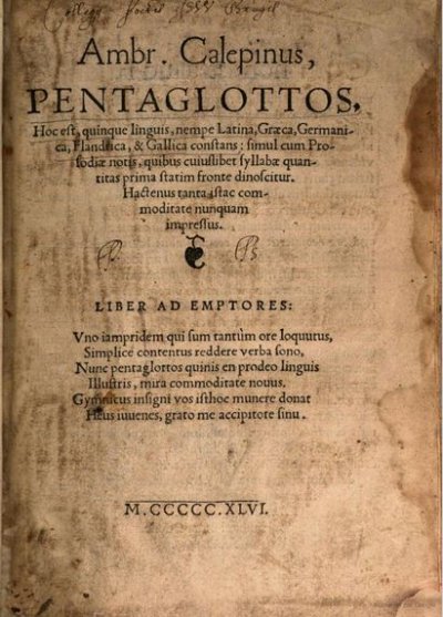 Calepino Ambrogio● Pentaglottos. Hoc est, quinque linguis, nempe Latina, Graeca, Germanica, Flandrica et Gallica constans : simul cum prosodiae notis hactenus tanta istac commoditate nunquam impressus● (Anvers) : (Gilles van Diest)● 1545● Ambr. Calepinus, || PENTAGLOTTOS, || Hoc est, quinque linguis, nempe Latina, Graeca, Germani- || cae, Flandrica, & Gallica constans : simul cum Pro- || sodiae notis, quibus cuiuslibet syllabae quan- || titas prima statim fronte dinoscitur. || Hactenus tanta istac com- || moditate nunquam || impressus. || [fleuron] || LIBER AD EMPTORES : || Vno iampridem qui sum tantùm ore loquutus, || Simplice contentus reddere verba sono, || Nunc pentaglottos quinis en prodeo linguis || Illustris, mira commoditate nouus. || Gymnicus insigni vos isthoc munere donat || Heus iuuenes, grato me acciptote sinu. || [-] || M. CCCCC. XLV. || USTC ● USTC : 66465 . Claes, 1974 : n°125 . Labarre, 1975 : n°68. Lindemann, 1985 : p.84. Lindemann, 1994 : p.546, «Ambr.[osius] CALEPINUS». Furno, 2008 : p.115.