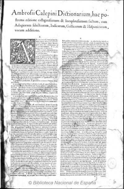 Commentaire La notice de l’exemplaire ayant pour cote U/4703 conservé à la Bibliothèque nationale d’Espagne a aujourd’hui pour titre Ambrosii Calepini Dictionarium : tanta tamque multa verborum tum Latinorum tum etiam Graecorum, quae suis Latinis bellissime respondent, loquendique formularum accessione adauctum & locupletatum, vt Thesaurus linguae latinae, non iniuriâ, dici possit ; adiunctae sunt praetera singulis vocibus Latinis Italicae, Gallicae et Hispanicae interpretationes ... subiuntcta sunt postremo & opportune Pauli Manutii Aldi F. additamenta ... (notice bdh0000015587).