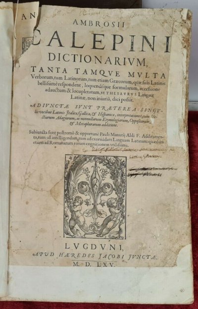 Calepino Ambrogio● Dictionarium, Tanta támque multa Verborum, tum Latinorum, tum etiam Graecorum, quae suis Latinis bellissimè respondent loquendique formularum, accessione adauctum & locupletatum, ut Thesaurus Linguae Latinae, non iniuriâ, dici possit. Adiectae sunt praeterea singulis vocibus Latinis Italicae, Gallicae, & Hispanicae, interpretationes, cum selectiorum Adagiorum, ac nonnullarum Etymologiarum, Oppositorum, & Metaphorarum additione● Lyon : Héritiers Giunta● 1565● AMBROSII || CALEPINI || DICTIONARIVM, || TANTA TAMQVE MVLTA || Verborum, tum Latinorum, tum etiam Graecorum, quae suis Latinis || bellisimè respondent, loquendi’que formularum, accessione || adauactum & locupletatum, vt THESAVRVS Linguae || Latinae, non iniuriâ, dici possit. || ADIVNCTAE SVNT PRAETEREA SINGV- || lis vocibus Latinis Italicae, Gallicae, & Hispanicae, interpretationes, cum sele- || ctiorum Adagiorum, ac nonnullarum Etymologiarum, Oppositorum, || & Metaphorarum additione. || Subiuncta sunt postremò & opportunè Pauli Manutij Aldi F. Additamen- || ta, tum ad intelligendam, tum ad exornãdam Linguam Latinam : quaedam etiam ad Romanarum rerum cognitionem vtilissima. || [Device] || LVGDVNI, || APVD HAEREDES JACOBI JVNCTAE. || [-] || M. D. LXV. USTC ● USTC : 66467 . Labarre, 1975 : n°109. Lindemann, 1994 : p.546, «Ambrosius CALEPINUS». Niederehe, 1995 : n°448.