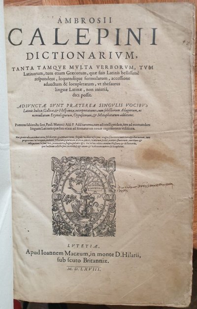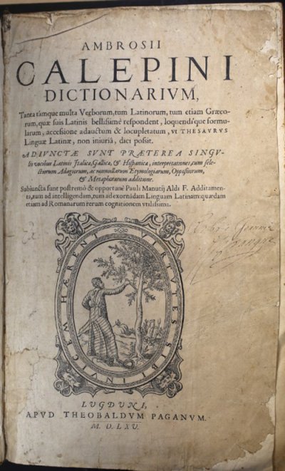 Calepino Ambrogio● Dictionarium, Tanta támque multa Verborum, tum Latinorum, tum etiam Graecorum, quae suis Latinis bellissimè respondent loquendique formularum, accessione adauctum & locupletatum, ut Thesaurus Linguae Latinae, non iniuriâ, dici possit. Adiectae sunt praeterea singulis vocibus Latinis Italicae, Gallicae, & Hispanicae, interpretationes, cum selectiorum Adagiorum, ac nonnullarum Etymologiarum, Oppositorum, & Metaphorarum additione● Lyon : Antoine Gryphe● 1565● AMBROSII || CALEPINI || DICTIONARIVM, || TANTA TAMQVE MVLTA || Verborum, tum Latinorum etaim Graecorum, quae suis Latinis || bellisimè respondant, loquendi’ que formularum, accessione || adauctum & locupletatum, vt THESAVRVS Linguae || Latinae, non iniuriâ, dici possit. || ADIVNCTE SVNT PRAETEREA SINGV- || lis vocibus Latinis Jtalicae, Gallicae, et Hispanicae, interpretationes, cum sele- || ctiorum Adagiorum, ac nonnullarum Etymologiarum, Oppositorum, || et Metaphorarum additione. || Subiuncta sunt postremò & opportuné Pauli Manutij Aldi F. Additemen- || ta, tum as intelligendam, tum ad exornãdam Linguam Latinam : quaedam || etiam ad Romanarum rerum cognitionem vtilissima. || [fleuron] || [Device] || LVGDVNI, || APVD ANTONIVM GRYPHIVM. || [-] || M. D. LXV. USTC ● USTC : 60935 . Labarre, 1975 : n°109. Lindemann, 1994 : p.546, «Ambrosius CALEPINUS». Niederehe, 1995 : n°447. Furno, 2008 : p.115.