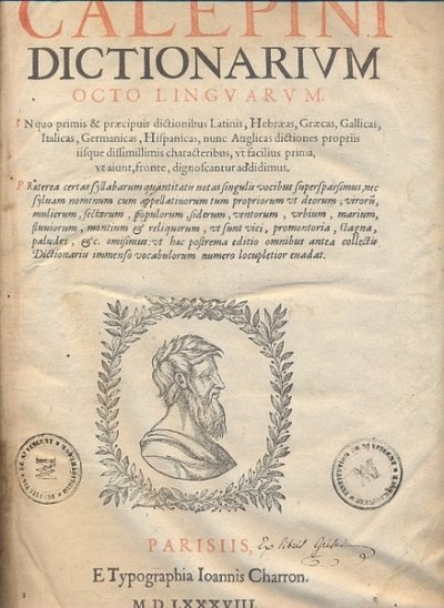 Calepino Ambrogio● Dictionarium octo linguarum. In quo primis & praecipuis dictionibus Latinis, Hebraeas, Graecas, Gallicas, Italicas, Germanicas, Hispanicas, nunc Anglicas dictiones propriis iisque dissimillimis characteribus, ut facilius prima, ut aiunt, fronte, dignoscantur addidimus● Paris : Jean Charron● 1588● Ambrosii || Calepini || Dictionarivm || octo lingvarvm. || In quo primis & praecipuis dictionibus Latinis, Hebraeas, Graecas, Gallicas, || Italicas, Germanicas, Hispanicas, nunc Anglicas dictiones propriis || iisque dissimillis characteribus, vt facilius prima, || vt aiunt, fronte dignoscantur addidimus. || PRaeterea certas syllabarum quantitatis notas singulis vocibus supersparsimus, nec || syluam nominum cum appellatiuorum tum propriorum vt deorum, virorum, || mulierum, sectarum, populorum, siderum, ventorum, vrbium, marium, || fluuiorum, montium & reliquorum, vt sunt vici, promontoria, stagna, || paludes, &c. omisimus : vt haec postrema editio omnibus antea collectis || Dictionariis immenso vocabulorum numero locupletior euadat. || < Marca > || Parisiis, || < ... > || M.D.LXXXVIII. || Niede95 ● USTC : 62340 . Labarre, 1975 : n°150. Bingen, 1987 : p.43 et 47, n°35. Lindemann, 1994 : p.554, «Ambrosius CALEPINUS». Niederehe, 1995 : n°719.
