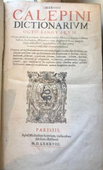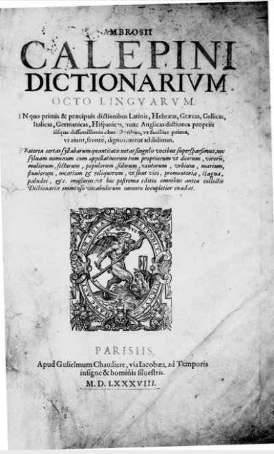 Calepino Ambrogio● Dictionarium octo linguarum. In quo primis & praecipuis dictionibus Latinis, Hebraeas, Graecas, Gallicas, Italicas, Germanicas, Hispanicas, nunc Anglicas dictiones propriis iisque dissimillimis characteribus, ut facilius prima, ut aiunt, fronte, dignoscantur addidimus● Paris : Michel Sonnius● 1588● Ambrosii || Calepini || Dictionarivm || octo lingvarvm. || In quo primis & praecipuis dictionibus Latinis, Hebraeas, Graecas, Gallicas, || Italicas, Germanicas, Hispanicas, nunc Anglicas dictiones propriis || iisque dissimillis characteribus, vt facilius prima, || vt aiunt, fronte dignoscantur addidimus. || PRaeterea certas syllabarum quantitatis notas singulis vocibus supersparsimus, nec || syluam nominum cum appellatiuorum tum propriorum vt deorum, virorum, || mulierum, sectarum, populorum, siderum, ventorum, vrbium, marium, || fluuiorum, montium & reliquorum, vt sunt vici, promontoria, stagna, || paludes, &c. omisimus : vt haec postrema editio omnibus antea collectis || Dictionariis immenso vocabulorum numero locupletior euadat. || < Marca > || Parisiis, || < ... > || M.D.LXXXVIII. || Niede95 ● USTC : 62345 . Labarre, 1975 : n°150. Bingen, 1987 : p.43 et 47, n°35. Lindemann, 1994 : p.554-555, «Ambrosius CALEPINUS». Niederehe, 1995 : n°721.