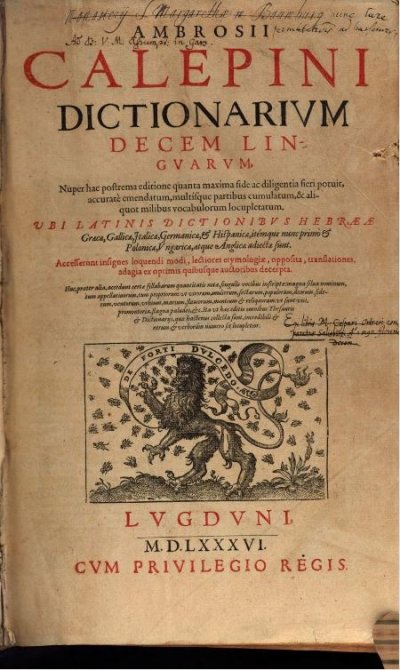 Calepino Ambrogio● Dictionarium decem linguarum ubi Latinis dictionibus Hebraeae, Graecae, Gallicae, Italicae, Germanicae et Hispanicae, itemque nunc primo Polonicae, Ungaricae, atque Anglicae adjectae sunt● Lyon : [Compagnie des libraires de Lyon]USTC ou [s.n.]● 1587● USTC : 62700 , 208144 . Labarre, 1975 : n°147. Bingen, 1987 : p.43 et 47, n°32. Lindemann, 1994 : p.553, «Ambrosius CALEPINUS». Niederehe, 1995 : n°706.