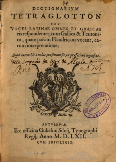 ● Anvers : (Christophe Plantin), Willem Silvius● 1562● DICTIONARIVM || TERAGLOTTON || SEV || VOCES LATINAE OMNES, || ET GRAECAE || eis respondentes, cum Gallica & Teutoni- || ca, quam passim Flandricam vocant, ea- || rum interpretatione. || Quid autem hîc à nobis praestitum sit, ex praefatione cognosces. || [Device] || ANTVERPIAE. || Ex officina Gulielmi Siluij, Typographi || Regij, Anno M. D. LXII. || CVM PRIVILEGIO. USTC ● USTC : 78217 . Musée Virtuel des Dictionnaires (MVD).