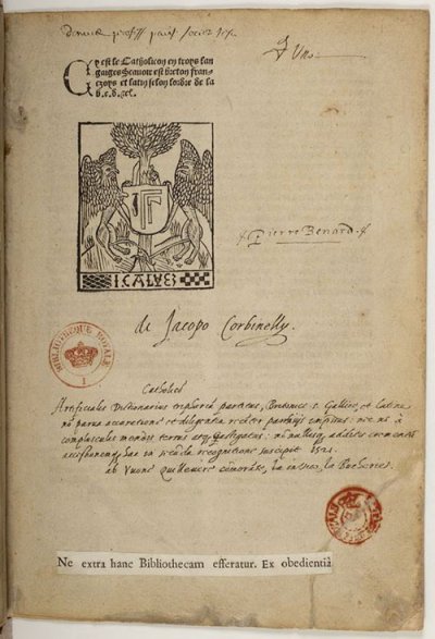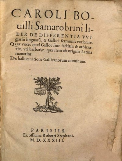 Bovelles Charles (de)● Caroli Bovilli Samarobrini Liber de differentia vulgarium linguarum, et gallici sermonis varietate, quae voces apud Gallos sint factitiae et arbitrariae, vel barbariae ; quae item ab origine latina manarint ; de hallucinatione Gallicanorum nominum● Paris : Robert Estienne● 1533 [=1534]USTC● CAROLI BO- || uilli Samarobrini li- || BER DE DIFFERENTIA VVL- || gariũ linguarũ, & Gallici sermonis varietate. || Quae voces apud Gallos sint factitiae & arbitra- || riae, vel barbariae : quae item ab origine Latina || manarint. || De hallucinatione Gallicanorum nominum. || [Device] || PARISIIS. || Ex officina Roberti Stephani. || M. D. XXXIII. USTC ● USTC : 203312 , 77279 . Draudius, 1625 : p.1382, «Grammatica Gallica. ». Beaulieux, 1904 : p.376 , «Bovelles, Boüelles, Bouille, Boville ou Bovillus (Carolus). ». Lindemann, 1994 : p.607, «Charles BOVELLES».