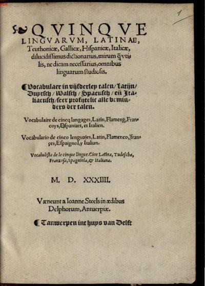 ● Anvers : Joannes Steelsius● 1534● [fleuron] QVINQVE || LINGVARVM, LATINAE, || Teuthonicae, Gallicae, Hispanicae, Italicae, || dilucidissimus dictionarius, mirum q̃ vti= || lis, ne dicam necessarius, omnibus || linguarum studiosis. || ¶ Uocabulaer in vijfderley talen / Latijn / || Duytsch / Walsch / Spaeusch / eñ Jta= || liaensch / scer profijtelir alle bemin= || ders der talen. || Vocabulaire de cincq langages, Latin, Flameng, Fran= || coys, Espaniart, et Italien. || Vocabulario de cinco lenguajes, Latin, Flamenco, fran= || çes, Espaignol, y Italian. || Vocabulista de le cinque lingue. Cioe Latina, Tudescha, || Franzosa, Spagniola, & Italiana. || M. D. XXXIIII. || Vaeneunt a Ioanne Steels in aedibus || Delphorum, Antuerpiae. || ¶ Tanwerpen int huys van Delft. || USTC ● USTC : 78072 , 343204 . Beaulieux, 1904 : p.375 , «Barlaimont, Barlamont, Berlemont ou Berlaimont (Noel de). ». Claes, 1974 : n°97 . Lindemann, 1994 : p.650. Niederehe, 1995 : n°248. Furno, 2008 : p.114.