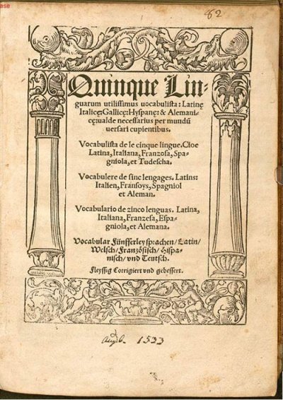 ● (Augsburg) : (Philipp Ulhart)● (1533)● [ornate frame] || Quinque Lin= || guarum utilissimus uocabulista : Latine || Italice : Gallice : Hyspane : & Alemani= || ce : ualde necessarius per mundũ || uersari cupientibus. || Vocabulista de le cinque lengue. Cioe || Latina, Italiana, Franzosa, Spa= || gniola, & Tudescha. || Vocabulere de sinc lengages. Latins : || Italien, Fransoys, Spagniol || & Aleman. || Vocabulario de zinco lenguas. Latina, || Italiana, Franzesa, Espa= || gniola, et Alemana. || Vocabular Fünfferley sprachen/ Latin/ || Welsch/ Französisch/ Hispa= || nisch/ vnd Teutsch. || Fleyssig Corrigiert vnd gebessert. USTC ● USTC : 78071 , 689122 . Lindemann, 1994 : p.649. Niederehe, 1995 : n°236.