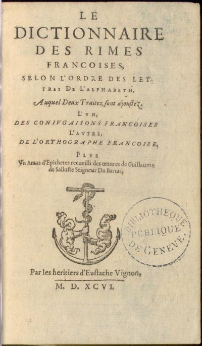La Noue Odet (ou) Pierre (de)]● Le dictionnaire des rimes francoises● [Genève] : Héritiers d’Eustache Vignon● 1596● LE || DICTIONNAIRE || DES RIMES || FRANCOISES, || SELON L’ORDRE DES LET- || TRES DE L’ALPHABETH. || Auquel Deux Traitez sont ajoustez. || L’VN, || DES CONIVGAISONS FRANCOISES || L’AVTRE, || DE L’ORTHOGRAPHE FRANCOISE, || PLVS || Vn Amas d’Epithetes recueilli des oeuures de Guillaume || de Salluste Seigneur Du Bartas. || [Device] || Par les heritiers d’Eustache Vignon, || [-] || M. D. XCVI. USTC ● USTC : 34486 . Musée Virtuel des Dictionnaires (MVD).