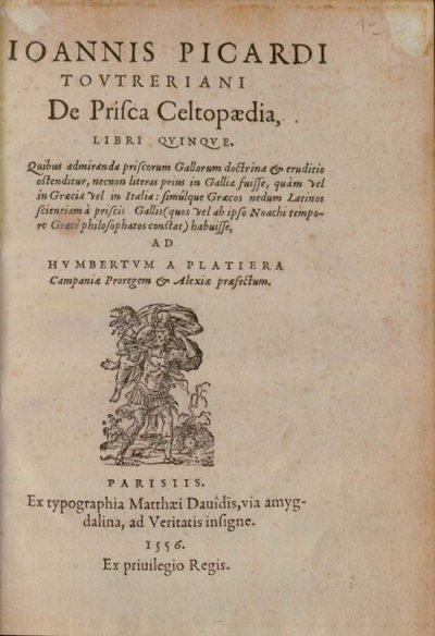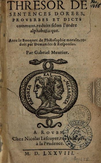 Nicot Jean● Thresor de la langue françoise tant ancienne que moderne auquel entre autres choses sont les noms propres de marine, vénerie & faulconnerie, cy-devant ramassez par Aimar de Ranconnet [...] reveu et augmenté en cette dernière impression de plus de la moitié par Jean Nicot [...] avec une grammaire françoise et latine & le recueil des vieux proverbes de la France, ensemble le Nomenclator de Junius mis par ordre alphabétic, & cieu d’une table particulière de toutes les dictons● Paris : David Douceur, Denys Duval● 1606● USTC : 6016155 . Musée Virtuel des Dictionnaires (MVD).