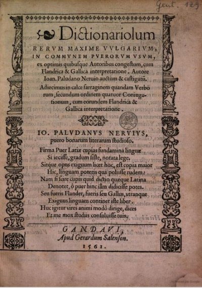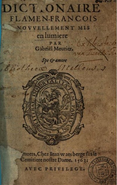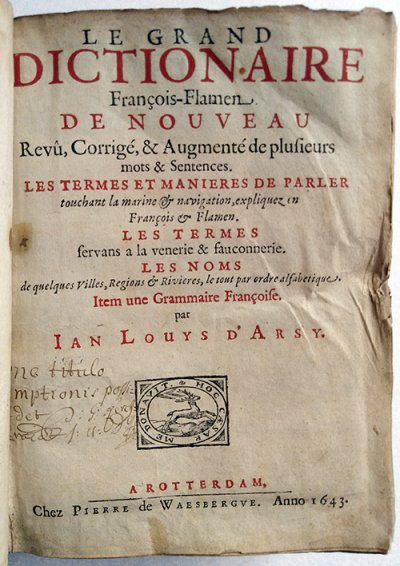 Arsy Jean-Louis (d’)● Le Grand dictionnaire françois-flamen● Rotterdam : Pieter Van Waesberge ; (Utrecht : E.W. Snellaert, Hendrick Van Borculo, Herman Van Borculo)● 1643● USTC : 1436121 . Musée Virtuel des Dictionnaires (MVD).