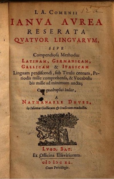 Comenius Johannes Amos :Duez Nathanaël● Janua aurea reserata quatuor linguarum sive compendiosa methodus latinam, germanicam, gallicam et italicam linguam perdiscendi● Leyde : Abraham Elzevier, Bonaventure Elzevier● 1640● I.A. COMENII || IANVA AVREA || RESERATA || QVATVOR LINGVARVM, || SIVE || Compendiosa Methodus || LATINAM, GERMANICAM, || GALLICAM & ITALICAM || Linguam perdiscendi, sub Titulis centum, Pe- || riodis mille comprehensa, & Vocabulis || bis mille ad minimum aucta ; || Cum quadruplici Indice, || A || NATHANAELE DHVEZ, || in Idioma Gallicum & ltalicum traducta. || [Marque] || LVGD. BAT. || Ex Officina Elseviriorum. || [Filet] || CIƆ IƆ CXL. || Cum Privilegio. Bingen87 ● USTC : 1011838 . Bingen, 1987 : p.58-59, n°A.1.
