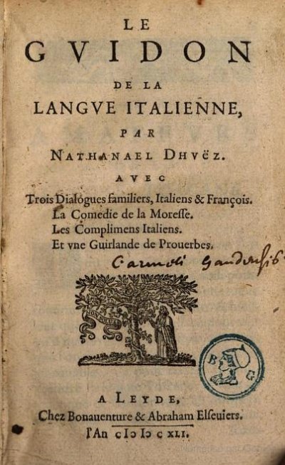 Duez Nathanaël● Le guidon de la langue italienne● Leyde : Abraham Elzevier, Bonaventure Elzevier● 1641● LE || GVIDON || DE LA || LANGVE ITALIENNE, || PAR || NATHANAEL DHVëZ. || AVEC || Trois Dialogues familiers, Italiens & François. || La Comedie de la Moresse. || Les Complimens Italiens. || Et vne Guirlande de Prouerbes. || [Marque] || A LEYDE, || Chez Bonauenture & Abraham Elseuiers. || [Filet] || l’An CIƆ IƆ CXLI. Bingen87 ● USTC : 1011826 . Bingen, 1987 : p.71 et 73, n°1.