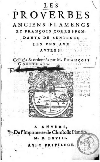 Goethals François● Les proverbes anciens flamengs et françois correspondants de sentence les uns aux autres● Anvers : Christophe Plantin● 1568● LES || PROVERBES || ANCIENS FLAMENGS || ET FRANÇOIS CORRESPON- || DANTS DE SENTENCE || LES VNS AVX || AVTRES : || Colligés & ordonnés par M. FRANÇOIS || GOEDTHALS. || [Device] || A ANVERS, || De l’Imprimerie de Christofle Plantin. || M. D. LXVIII. || AVEC PRIVILEGE. USTC ● USTC : 13557 . Musée Virtuel des Dictionnaires (MVD).