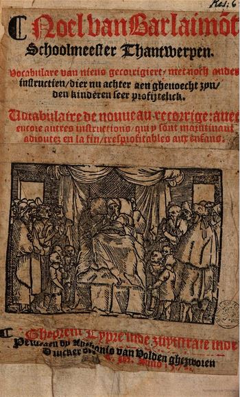 Berlaimont Noël (de)● Vocabulare van nieus ge corrigiert. Vocabulaire de nouveau recorrige● Ypres : Anthonis van Volden● 1572● ¶ Noel van Barlaimõt || Schoolmeester Thantwerpen. || Vocabulare van niens ge corrigiert/met noch andes || instruction/dier nu achter aen ghenoecht zyn/ || den kinderen seer profijtelica. || Uocabulaire de nouueau recorrige : auec || encore autres instructions/qui y sont maintinant || adioutez en la fin/tresprofitables aux enfans. || [woodcut of people surrounding ill man on bed] || ¶ Th[..]prem Lypre inde zuytstrate inde || [...] || Pe[...] by Anthonis van Volden ghezivoren || [...] Anno. 1572. USTC ● USTC : 76336 . Claes, 1974 : n°228 . Lindemann, 1994 : p.605, «Noël van BERLAIMONT».
