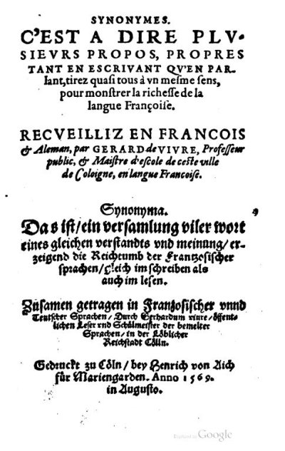 Vivre Gérard (de)● Synonymes : c’est a dire plusieurs propos, propres tant en escrivant qu’en parlant, tirez quasi tous à un mesme sens, pour monstrer la richesse de la langue Françoise● Cologne : Heinrich von Aich● 1569● SYNONYMES. || C’EST A DIRE PLV= || SIEVRS PROPOS, PROPRES || TANT EN ESCRIVANT QV’EN PAR- || lant, tirez quasi tous à vn mesme sens, || pour monstrer la richesse de la || langue Françoise. || RECVEILLIZ EN FRANCOIS || & Aleman, par GERARD de VIVRE, Professeur || public, & Maistre d’escole de ceste ville || de Coloigne, en langue Francoise. || Synonyma. || Das ist/ ein versamlung viler wort || eines gleichen verstandts vnd meinung/ er- || zeigend die Reichtumb de Franzosischer || sprachen/ gleich im schreiben als || auch im lesen. || Zusamen getragen in Franzosischer vnnd || Teutscher Sprachen/ Durch Gerhardum viure/ öffent= || lichen Leser vnd Schülmeister der bemelter || Sprachen/ in der Löblicher || Reichstadt Cölln. || Gedruckt zu Cöln/ bey Henrich von Aich || für Mariengarden. Anno 1569. || in Augusto. USTC ● USTC : 37530 . Musée Virtuel des Dictionnaires (MVD).