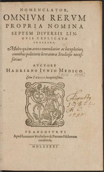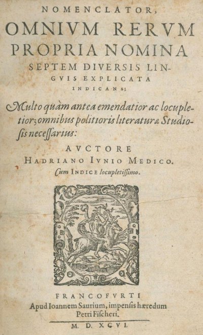 Junius Hadrianus● Nomenclator, omnium rerum propria nomina septem diversis linguis explicata indicans● Francfort-sur-le-Main : Peter Fischer, Johannes Saur aus Wetter● 1596● NOMENCLATOR, || OMNIVM RERVM || PROPRIA NOMINA || SEPTEM DIVERSIS LIN- || GVIS EXPLICATA || INDICANS ; || Multo quàm antea emendatior ac locuple- || tior ; omnibus politioris literaturae Studio- || sis necessarius : || AVCTORE || HADRIANO IVNIO MEDICO. || Cum INDICE locupletissimo. || [device] || FRANCOFVRTI || Apud Ioannem Saurium, impensis haeredum || Petri Fischeri. || [-] || M. D. XCVI. USTC ● USTC : 83858 , 78444 , 441569 , 441570 , 678264 . Beaulieux, 1904 : p.390 , «Junius (Hadrianus). ». Claes, 1974 : n°333 et 334 . Lindemann, 1994 : p.584, «Hadrianus JUNIUS». Niederehe, 1995 : n°809.