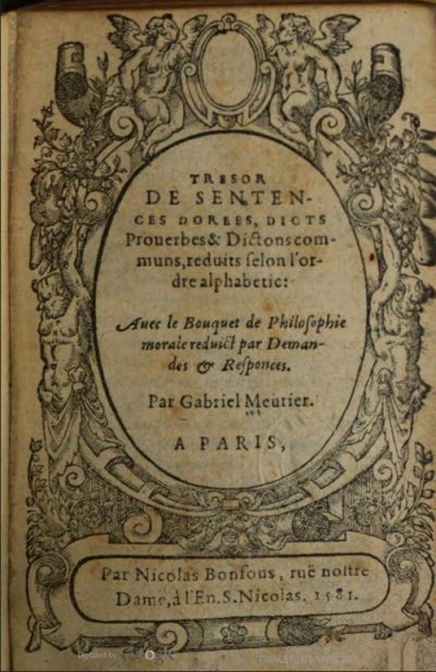 Meurier Gabriel● Tresor de sentences dorees, dicts, proverbes et dictons communs● Paris : Nicolas Bonfons● 1581● [Decorated border] || TRESOR || DE SENTEN- || CES DOREES, DICTS || Prouerbes & Dictons com- || muns, reduits selon l’or- || dre alphabetic : || Auec le Bouquet de Philosophie || morale reduict par Deman- || des & Responces. || Par Gabriel Meurier. || A PARIS, || Par Nicolas Bonfons, ruë nostre || Dame, à l’En.S.Nicolas.1581. || USTC ● USTC : 57247 . 1 langue : Français ♢