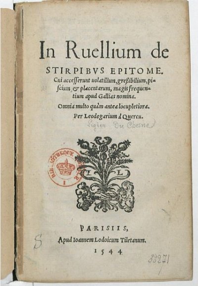 Du Chesne Léger● In Ruellium de stirpibus epitome● Paris : Jean Loys● 1544● In Ruellium de || STIRPIBVS EPITOME. || Cui accesserunt uolatilium, gressibilium, pi˶ || scium, & placentarum, magis frequen˶ || tium apud Gallias nomina. || Omnia multo quàm antea locupletiora. || Per Leodegarium á Quercu. || [Vignette : I || L] || PARISIIS. || Apud Ioannem Lodoicum Tiletanum. || 1544 ● BP16 : BP16_111674 . USTC : 78110 , 149196 . Beaulieux, 1904 : p.381 , «Duchesne (Léger). ». Lindemann, 1994 : p.563, «Léger DUCHESNE».