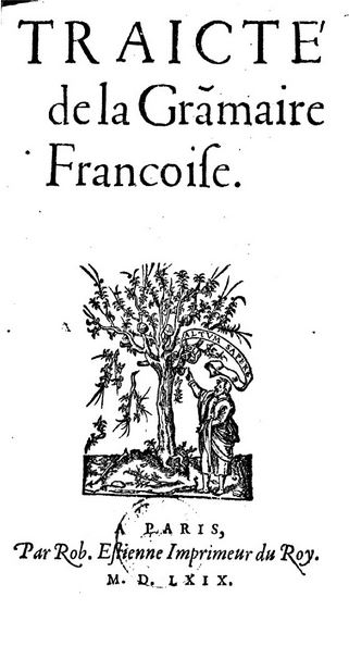 Estienne Robert]● Traicté de la grammaire francoise● Paris : Robert Estienne● 1569● TRAICTE’ || de la Grãmaire || Francoise. || [Device] || A PARIS, || Par Rob. Estienne Imprimeur du Roy. || M. D. LXIX. || USTC ● USTC : 39414 . Lindemann, 1994 : p.628, «[Robert ESTIENNE,]».