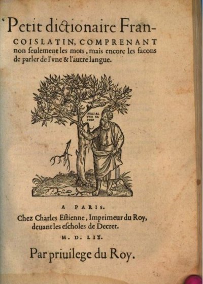 Estienne Robert]● Dictionarium, seu Latinae linguae Thesaurus, Non singulas modò dictiones continens, sed integras quoque Latinè & loquendi, & scribendi formulas ex optimis quibusque authoribus accuratissimè collectas. Cum Gallica ferè interpretatione● [1ère éd.]Wool78● Paris : Ex officina Robert Estienne● 1531● 2 tomes en 1 ou 2 vol.● BP16 : BP16_106679 . USTC : 146288 . Beaulieux, 1904 : p.385 , «Estienne (Robert). ». Wooldridge, 1978, 2e éd. 2001 : Annexe. Lindemann, 1994 : p.565, «[Robert ESTIENNE]».