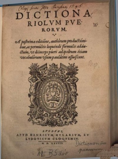 Estienne Robert]● Dictionariolum puerorum. A’ postréma editiõne, authõrum productiónibus, ac permúltis loquéndi fórmulis adáuctum, ut déinceps púeri ad ipsõrum étiam vocabulõrum usum paulãtim assuéscant● Lyon : Louis Cloquemin, Henri Hylaire● 1564● DICTIONA- || RIOLVM PVE- || RORVM, || *** || A’ postréma editiõne, authõrum productióni- || bus, ac permúltis loquéndi fórmulis adáu- || ctum, vt déinceps púeri ad ipsõrum étiam || vocabulõrum vsum paulãtim assuéscant. || [Device] || LVGDVNI, || APVD HENRICVM HYLARIVM, ET || LVDOVICVM CLOQVEMIN. || [-] || M. D. LXIIII. USTC ● USTC : 24406 . Lindemann, 1994 : p.571, «[Robert ESTIENNE]».