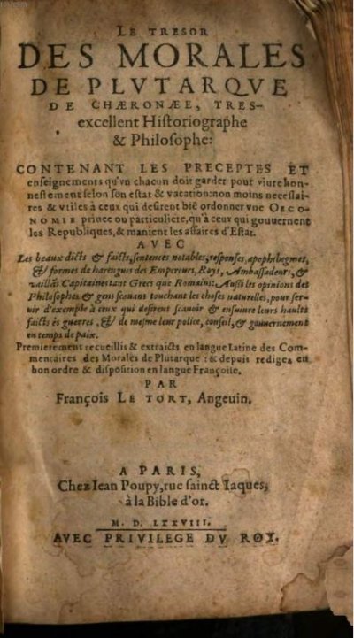 Le Tort François● Le tresor des morales de Plutarque de Chaeronaee● Paris : Jean Poupy● 1578● LE TRESOR || DES MORALES || DE PLVTARQVE || DE CHAERONAEE, TRES- || excellent Historiographe || & Philosophe : || CONTENANT LES PRECEPTES ET || enseignements qu’vn chacun doit garder pour viure hon- || nestement selon son estat & vacation : on [sic] moins necessai- || res & vtiles à ceux qui desirent bi e ordonner vne OECO- || NOMIE priuee ou particuliere, qu`à ceux qui gouuernent || les Republiques, & manient les affaires d’Estat. || AVEC || Les beaux dicts & faicts, sentences notables, responses, apophthegmes, || Et formes de harengues des Empereus, Roys, Ambassadeurs, & || vaillãs Capitaines tant Grecs que Romains : Aussi les opinions des || Philosophes & gens scauans touchant les choses naturelles, pour ser- || uir d’exemple à ceux qui desirent scauoir & ensuiure leurs haults || faicts és guerres, et de mesme leur police, conseil, & gouuerment || en temps de paix. || Premierement recueillis & extraicts en langue Latine des Com- || mentaires des Morales de Plutarque : & depuis redigez en || bon ordre & disposition en langue Françoise. || PAR || François LE TORT, Angeuin. || A PARIS, || Chez Iean Poupy, rue sainct Iaques, || à la Bible d’or. || M. D. LXXIII. || [-] || AVEC PRIVILEGE DV ROY. USTC ● USTC : 38426 , 62871 . 1 langue : Français ♢