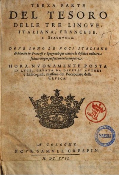 Vittori Girolamo● Tesoro de las lenguas, francesa, italiana y española. [et] Thresor des trois langues, francoise, italienne, et espagnole [et] Tesoro delle tre lingue, italiana, francese e spagnuola● Cologny ou [Genève] : Samuel Crespin, Pierre de La Rovière● 1616-1617● 3 tomes● USTC : 5023985 . 13 localisations dans des établissements documentaires : Anvers = Antwerpen (Be), Museum Plantin-Moretus ♢ Berkeley, CA (USA), Berkeley University Library ♢ Berne = Bern (Ch), Stadt- und Universitätsbibliothek ♢ Cambridge (UK), University Library ♢ Cambridge, MA (USA), Harvard University (Botany Libraries Arnold Arboretum Library, Ernst Mayr Zoology Library, Harvard Medical Library, Houghton Library, etc.) ♢ Coburg (De), Landesbibliothek ♢ Le Mans (Fr), Médiathèque Louis Aragon ♢ Lisboa (Pt), Biblioteca Nacional de Portugal ♢ Nancy (Fr), Bibliothèque municipale ♢ New York, NY (USA), Hispanic Society ♢ Provo, UT (USA), Brigham Young University Libraries (Harold B. Lee Library) ♢ Tours (Fr), Université François Rabelais de Tours, Bibliothèques universitaires (Centre d’Études Supérieures de la Renaissance, Fonds Ferdinand Brunot, etc.) ♢ Valladolid (Es), Biblioteca Universitaria ♢