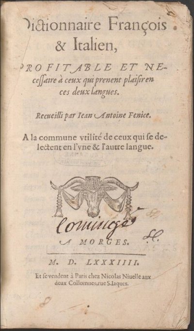Fenice Giovanni Antonio● Dictionnaire françois et italien● Morges : [Jean Le Preux]Bingen87 ; Paris : Nicolas Nivelle● 1584● Dictionnaire François || & Italien, || PROFITABLE ET NE-|| cessaire à ceux qui prenent plaisir en || ces deux langues. || Recueilli par Iean Antoine Fenice. || A la commune vtilité de ceux qui se de-|| lectent en l’vne & l’autre langue. || [Fleuron] || A MORGES. || [Filet] || M.D.LXXXIIII. || Et se vendent à Paris chez Nicolas Niuelle aux || deux Collomnes, rue S. Iaques. Bingen87 ● USTC : 78361 . Beaulieux, 1904 : p.387 , «Fénice (Jean Ant.) Phénice ou Félis. ». Bingen, 1987 : p.97-98, n°1a2. Lindemann, 1994 : p.580, «Jean Antoine FENICE».