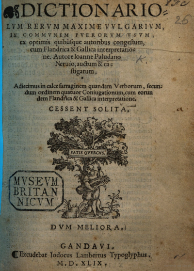 Paludanus Johannes● Dictionariolum rerum maxime vulgarium in communem puerorum usum, cum Flandrica et Gallica interpretatione● Gand : Joos Lambrecht● 1549● USTC : 78142 . Claes, 1974 : n°136 . Lindemann, 1994 : p.594, «Joannes PALUDANUS».