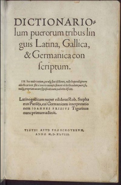 Estienne Robert :Frisius Johannes● Dictionariolum puerorum tribus linguis Latina, Gallica, et Germanica conscriptum● Zürich : Christoph Froschauer● 1548● DICTIONARIO= || lum puerorum tribus lin || guis Latina, Gallica, || & Germanica con || scriptum. || In hoc nudae tantum, puraeq̃ ; sunt dictiones, nullo loquendi genere || adiecto : ut inde sibi à teneris exempla sumant ad declinandum pueri, si= || mulq̃ ; propriam uocum significationem paulatim discant. || Latinogallicum nuper ediderat Rob. Stepha || nus Parisijs, cui Germanicam interpretatio || nem IOANNES FRISIVS Tigurinus || nunc primum adiecit. || TIGVRI APVD FROSCHOVERVM. || ANNO M. D. XLVIII. USTC ● USTC : 39308 , 636312 . Musée Virtuel des Dictionnaires (MVD).