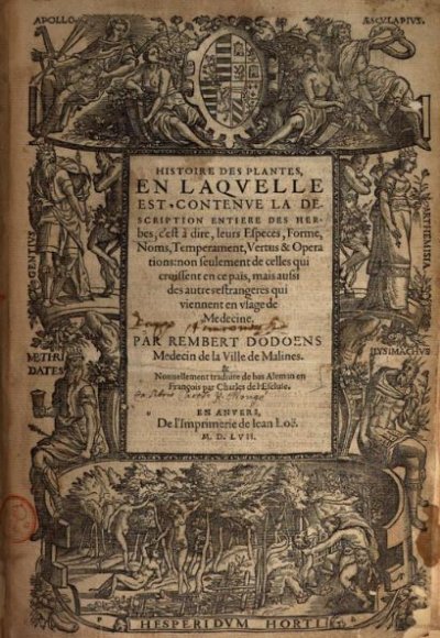 Dodoens Rembert :L’Écluse Charles (de)● Histoire des plantes : en laquelle est contenue la description entiere des herbes, c’est à dire, leurs especes, forme, noms, temperament, vertus et operations● Anvers : Jan van der Loe● 1557● [Decorated Border] || HISTOIRE DES PLANTES, || EN LAQVELLE || EST CONTENVE LA DE- || SCRIPTION ENTIERE DES HER- || bes, c’est à dire, leurs Especes, Forme, || Noms, Temperament, Vertus & Opera || tions : non seulement de celles qui || croissent en ce païs, mais aussi || des autres estrangeres qui || viennent en vsage de || Medecine. || PAR REMBERT DODOENS || Medecin de la Ville de Malines. || & || Nouuellement traduite de bas Aleman en || François par Charles de l’Escluse. || EN ANVERS, || De l’Imprimerie de Iean Loë. || M. D. LVII. || USTC ● USTC : 24365 . 5 langues : Allemand ♢ Français ♢ Grec ♢ Latin ♢ Néerlandais ♢