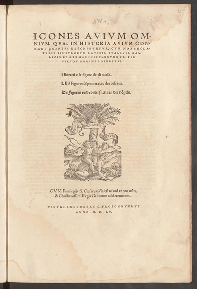 Gessner Conrad● Conradi gesneri tigurini medici & philosophiae professoris in schola tigurina, historiae animalium liber III. Qui est de auium natura. Adiecti sunt ab initio indices alphabetici decem super nominibus auium in totidem linguis diversis● Zurich : Christoph I Froschauer● 1555● Conradi gesneri || Tigurini medici & Philosophire pro=||fessoris in Schola Tigurina, Histo=||riae Animalium Liber III || qui est de Auium || natura. || Adiecti sunt ab initio Indices alphabetici decem super nominibus Auium || in totides linguis diuersis : & ante illos Enumeratio Auium eo ordine quo in || hoc Volumine continentur. || < Marca de Ch. Froschauer > || Cvm Priuilegijs S.Caesareae Maiestatis ad actennium, & Christia=||nissimi Regis Galliarum ad decennium. || Tigvri apvd Christoph. Froschavervm, || Anno M. D. LV. Niede95 ● USTC : 624829 . Musée Virtuel des Dictionnaires (MVD).