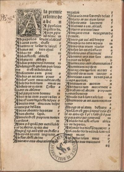 ● Paris[!?] : Antoine Caillaut● [1482]USTC ou [ca. 1482]Lind94 ou [ca. 1482-1484]BnF/GW/ISTC/Shaw97 ou [entre 1482 et 1484]Lind85● [a la premiere lettre de a.b.c.n // A preposition in gallico du] BnF ● CCfr via BnF. GW : 06227 . ISTC : ic00285580 . USTC : 70072 . Lindemann, 1985 : p.58 et 77. Lindemann, 1994 : p.557. Shaw, 1997 : Bibliographie C.