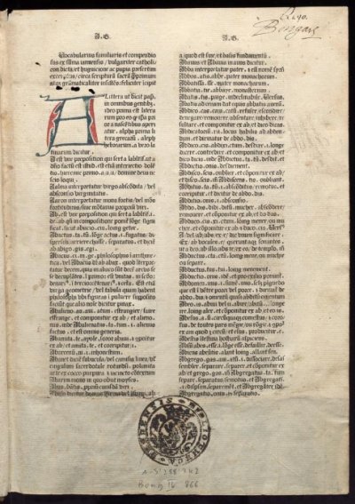 « Caillaut c.1482 (C1) Caillaut named his dictionary Catholicum abbreviatum, as shown on the title page of the only existing copy of his first edition (see Plate 5). This edition is dated c.1492 by GKW (VI : 259, n° 6233), but we believe this dating to be incorrect. We conclude, from careful scrutiny of Caillaut’s manuscript and all of his editions, that this edition was the earliest of the three, and we have provisionally assigned it a date of c.1482. » (SHAW, 1997 : 4.2.1. Antoine Caillaut, Paris).
