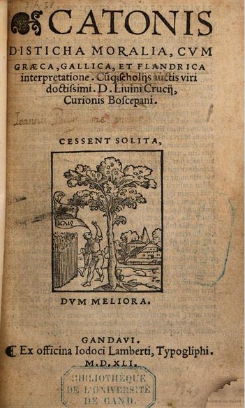 Cato Dionysius● Disticha moralia, cum Graeca, Gallica, et Flandrica interpretatione● Gand : Josse Lambert● 1541● [fleuron] CATONIS || DISTICHA MORALIA, CVM || GRAECA, GALLICA, ET FLANDRICA || interpretatione. Cũqzscholñs [sic] auctis viri || doctissimi. D. Liuini Crucñ, || Curionis Boscepani. || [Device] || GANDAVI. || ¶ Ex officina Iodoci Lamberti, Typogliphi. || M. D. XLI. USTC ● USTC : 80772 . 3 langues : Français ♢ Grec ♢ Latin ♢