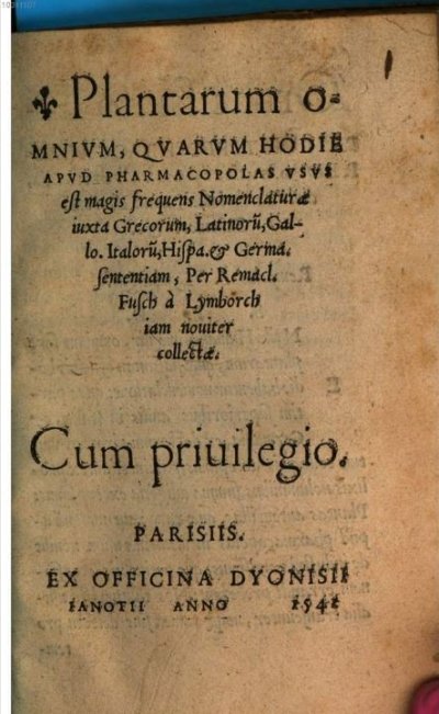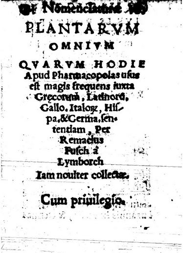 Fuchs Remaclus● Nomenclaturae plantarum omnium quarum hodie apud pharmacopolas usus est magis frequens iuxta Graecorum, Latinorum, Gallo, Italorum, Hispa. & Germa. sententiam, per Remaclus Fusch a Lymborch. Iam noviter collectae● Venise : Venturino Ruffinelli● 1542● USTC : 831090 . 6 langues : Allemand ♢ Espagnol ♢ Français ♢ Grec ♢ Italien ♢ Latin ♢