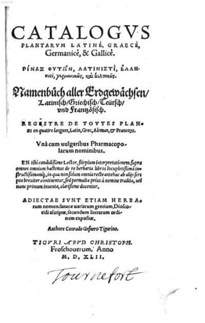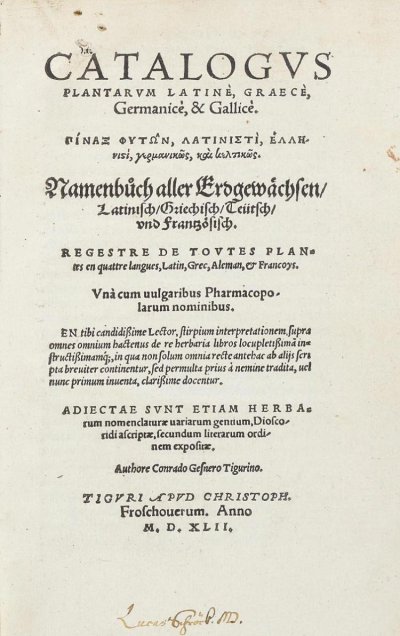 Gessner Conrad● Catalogus plantarum Latinè, Graecè, Germanicè, & Gallicè. Pinax phyton, namenbuch aller erdgewaechsen regestre de toutes plantes unà cum vulgaribus pharmacopolarum nominibus. Adiectae sunt etiam herbarum nomenclaturae variarum gentium, dioscoridi ascriptae, secundum literarum ordinem expositae● Zürich : Christoph I Froschauer● 1542● CATALOGVS || PLANTARVM LATINÈ, GRAECÈ, || Germanicè, & Gallicè. || [two lines of greek] || Namenbüch aller Erdgewächsen/ || Latinisch/ Griechisch/ Teütsch/ || vnd französisch. || REGESTRE DE TOVTES PLAN= || tes en quattre langues, Latin, Grec, Aleman, & Francoys. || Vnà cum uulgaribus Pharmacopo- || larum nominibus. || EN tibi candidissime Lector, stirpium interpretationem, supra || omnes omnium hactenus de re herbaria libros locupletissimã in= || structissimamq̃ ;, in qua non solum omnia recte antehac ab alijs scri || pta breuiter continentur, sed permulta prius à nemine tradita, uel || nunc primum inuenta, clarissime docentur. || ADIECTAE SVNT ETIAM HERBA= || rum nomenclaturae uariarum gentium, Diosco- || ridi ascriptae, secundum literarum ordi- || nem expositae. || Authore Conrado Gesnero Tigurino. || TIGVRI APVD CHRISTOPH. || Froschuerum. Anno || M. D. XLII. USTC ● USTC : 619851 , 57958 . Musée Virtuel des Dictionnaires (MVD).