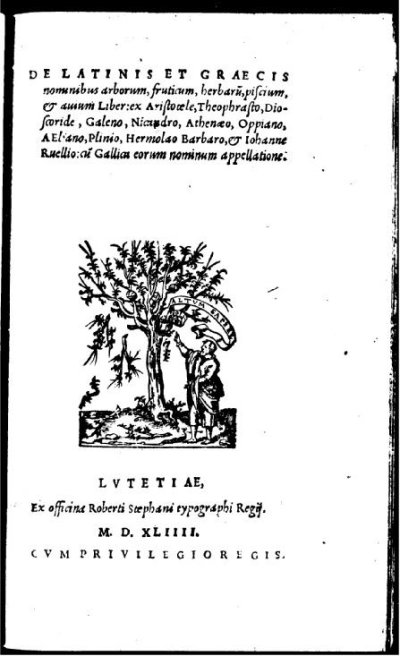 Estienne Charles]● De latinis et graecis nominibus arborum, fruticum, herbarum, piscium et avium liber● Paris : Robert I Estienne● 1545● DE LATINIS ET GRAECIS || nominibus arborum, fructicum, herbarũ, piscium, || & auium Liber : ex Aristotele, Theophrasto, Dio- || scoride, Galeno, AEtio, Paulo AEgineta, Actuario, || Nicandro, Athenaeo, Oppiano, AEliano, Plinio, || Hermolao Barbaro, & Iohanne Ruellio : cum Gal- || lica eorum nominũ appellatione. || AEditio secunda, cui multa accesserunt. || [device : tree and man] || LVTETIAE. || Ex officina Roberti Stephani typographi Regij. || M. D. XLV. || CVM PRIVILEGIO REGIS USTC ● BP16 : BP16_112069 . USTC : 78117 . Beaulieux, 1904 : p.382 , «Estienne (Charles). ». Lindemann, 1994 : p.564, «[Charles ESTIENNE]».