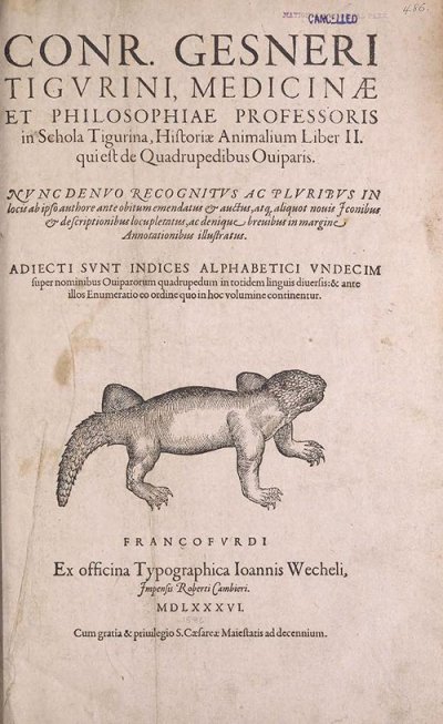 Gessner Conrad :Carronus Jacob ;Wolf Caspar● Conradi gesneri tigurini medicinae et philosophiae professoris in schola tigurina, historiae animalium Lib.V.● Zürich : Froschoviana officina● 1587● Conradi Ges=||neri tigvrini medici-||nae et philosophiae professoris || in Scholam Tigurinam, Historiae anim-||lium Lib. V. qui est de Ser-||pentium natura. || Ex variis schedis et collecta=||neis eivsdem compositvs per || Iacobum Carronum Francofurtensem. || Adiecta est ad calcem, scorpio-||nis insecti Historia à D. Casparo Vuolphio Tigurino Medico, || ex eiusdem Paralipomensis conscripta. || Accesservnt indices nominvm ser-||pentium secundum diuersas linguas : & ante illos enumeratio || eo ordine quo in hoc volumine continentur. || < Marca de Froschauer > || Tigvri || in officina Froschoveriana. || M. D. LXXXVII. || Cum gratia & priuilegio S. Caesarea Maiestatis ad decennium. Niede95 ● USTC : 624825 . Musée Virtuel des Dictionnaires (MVD).