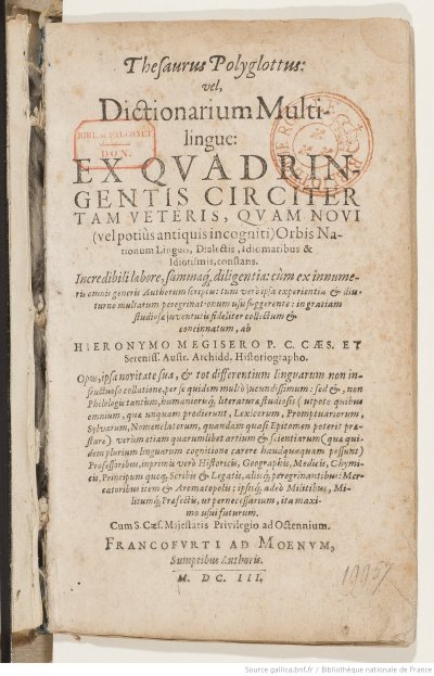 Megiser Hieronymus● Thesaurus polyglottus● Francfort-sur-le-Main : [s.n.]● 1603● USTC : 2135661 . Musée Virtuel des Dictionnaires (MVD).