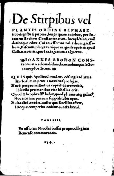 Brohon Jean● De stirpibus vel plantis ordine alphabetico digestis epitome● Paris : Nicolas Buffet● 1543● BP16 : BP16_111018 . USTC : 78105 . Lindemann, 1994 : p.546, «Jean BROHON».