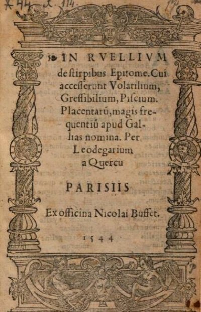 Du Chesne Léger● In ruellium de stirpibus epitome● Paris : Nicolas Buffet● 1544● État B● [ornate frame] [fleuron] IN RVELLIVM || de stirpibus Eptiome. Cui || accesserunt Volatilium, || Gressibilium, Piscium. || Placentarũ, magis fre- || quentiũ apud Gal- || lias nomina Per || Leodegaium || a Quercu || PARISIIS || Ex officina Nicolai Buffet. || 1544. USTC ● BP16 : BP16_111672 . Lindemann, 1994 : p.562, «Léger DUCHESNE».