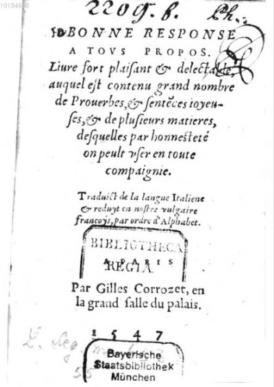 Bellère Jean]● Bonne response a tous propos● Paris : Gilles Corrozet● 1547● [Fleuron aldin] BONNE RESPONSE || A TOVS PROPOS. || Liure fort plaisant & delectable, || auquel est contenu grand nombre || de Prouerbes, & sentẽces ioyeu-|| ses, & de plusieurs matieres, || desquelles par honnesteté || on peult vser en toute || compaignie. || Traduict de la langue ltaliene || & reduyt en nostre vulgaire || francoys, par ordre d’Alphabet. || A PARIS || Par Gilles Corrozet, en || la grand’ salle du palais. || 1547 Bingen87 ● USTC : 39127 . Bingen, 1987 : p.37, n°1.b..